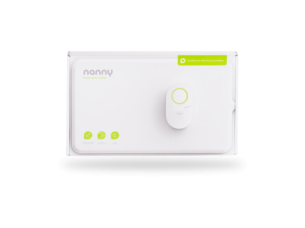 Monitor dechu Nanny monitoruje dýchání dítěte, detekuje položení a odejmutí miminka na podložku. Střeží dítě 24 hodin denně. Podložka neustále vyhodnocuje vzruchy z okolí a v případě, že došlo k položení miminka, upozorní Vás na nutnost přístroj zapnout. Stejně tak Vás upozorní na nutnost vypnutí, pokud jste miminko vyjmuli z postýlky a monitor zapomněli vypnout. Testem funkčnosti vyhodnocovací jednotka rovněž hlídá stáří podložky a upozorní na prošlou dobu životnosti. Rovněž hlídá teplotu v místnosti, aby nedošlo k přehřátí miminka, což je jeden z rizikových faktorů tzv. Syndromu náhlého úmrtí kojence. Nanny BM-03 je certifikovaný zdravotnický prostředek, který je vhodný i pro nedonošená miminka od 1 kg hmotnosti. Je napájen ze 2 tužkových baterií, má noční lampičku a intenzitu jasu automaticky přizpůsobuje okolnímu prostředí. Detekční plochu v postýlce lze rozšířit připojením druhé podložky. Součástí balení je vyhodnocovací jednotka, snímací podložka, klip na zavěšení, držák a suchý zip, stojánek, alkalické baterie.