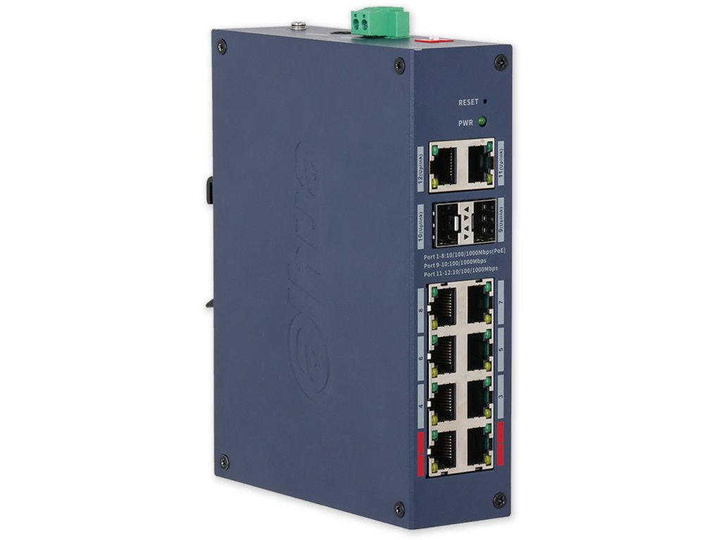 Průmyslový PoE switch, Cloud management L2 (DolynkCare), 8 x PoE 10/100/1000 Mbps, 2 x RJ-45 10/100/1000 Mbps, 2 x SFP 100/1000 Mbps uplink, celkový budget je 110 W, IEEE 802.3af; IEEE 802.3at; Hi-PoE, IEEE 802.3bt. Přepěťové ochrany, kov, police/DIN, napájecí zdroj součástí balení, dual power.
