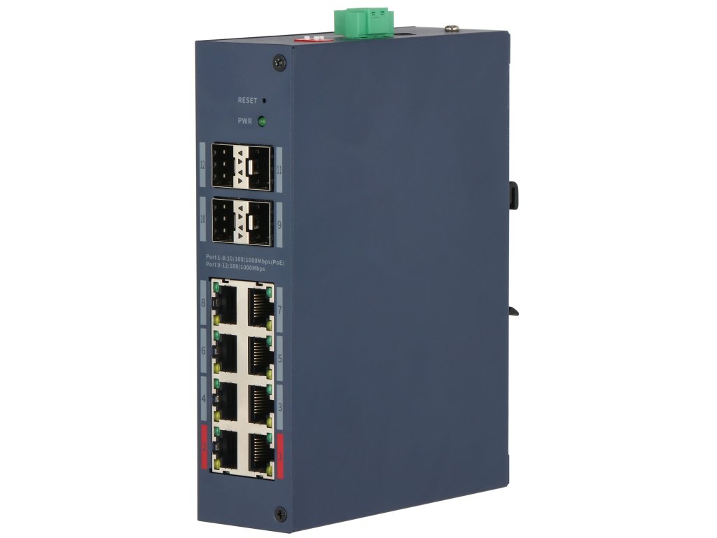 Průmyslový PoE switch, Cloud management L2 (DolynkCare), 8 x PoE 10/100/1000 Mbps, 4 x SFP 100/1000 Mbps uplink, celkový budget je 125 W. Přepěťové ochrany, kov, police/DIN, napájecí zdroj součástí balení, dual power.