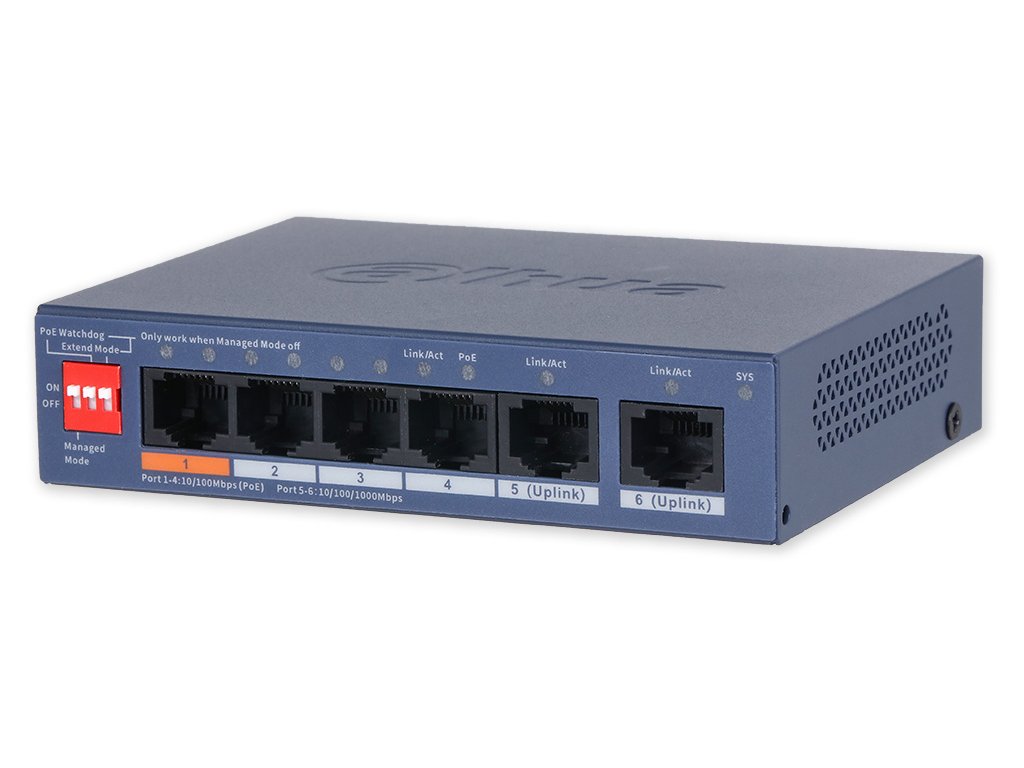 PoE switch, Cloud management L2 (DolynkCare), 4 x PoE 10/100 Mbps, 2 x RJ-45 uplink 10/100/1000 Mbps, celkový budget je 60 W, IEEE 802.3af; IEEE 802.3at; Hi-PoE. Přepěťové ochrany, kov, police, napájecí zdroj součástí balení.