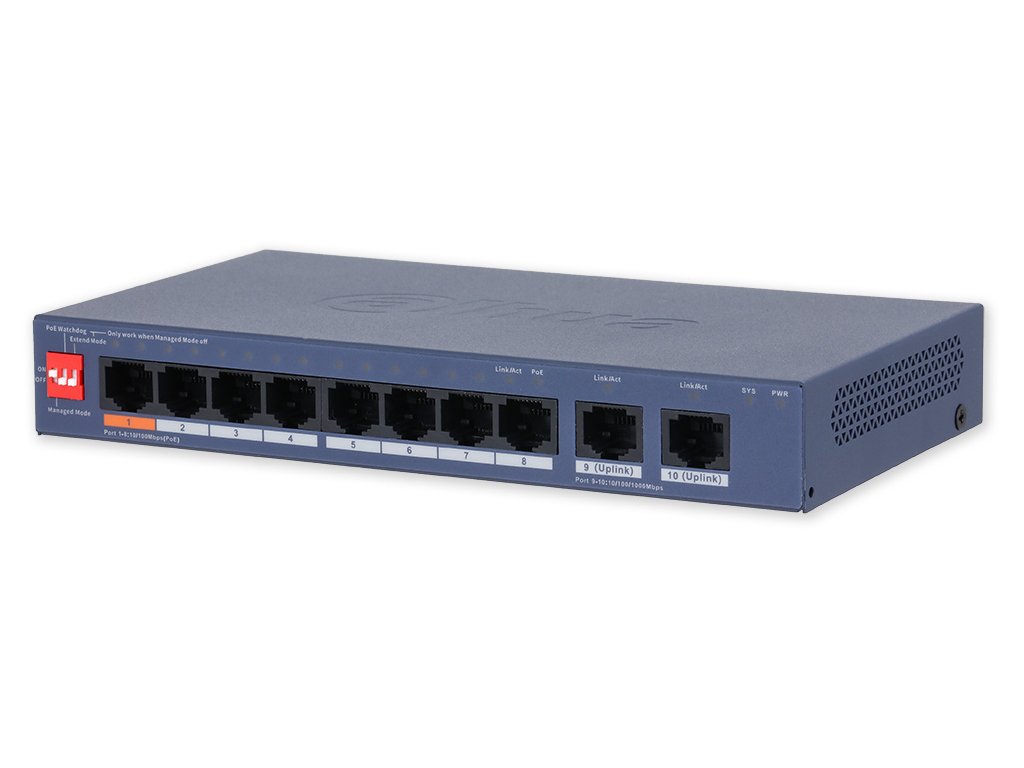 PoE switch, Cloud management L2 (DolynkCare), 8 x PoE 10/100 Mbps, 2 x RJ-45 uplink 10/100/1000 Mbps, celkový budget je 60 W, IEEE 802.3af; IEEE 802.3at; Hi-PoE. Přepěťové ochrany, kov, police, napájecí zdroj součástí balení.
