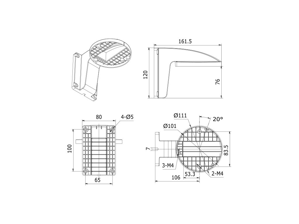 Držák na stěnu pro dome kamery. Rozměry 80 x 120 x 160 mm. Pro kamery o průměru 110mm. Má prostor pro kabelový spoj. Bílá barva.