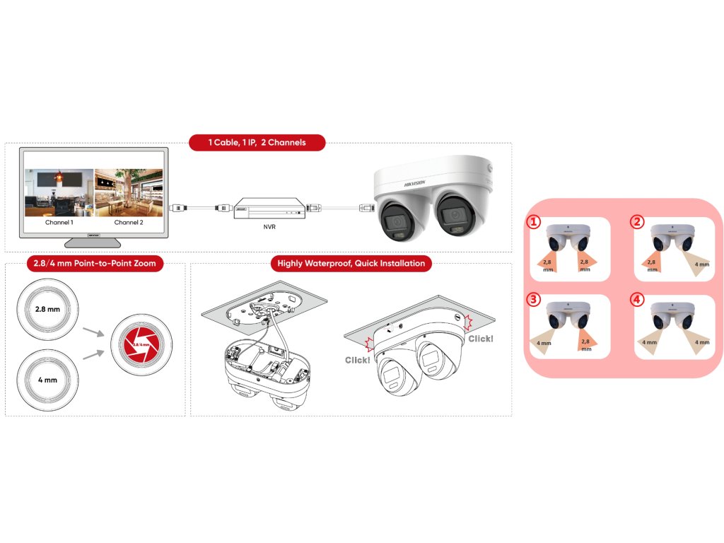 Důležité vlastnosti: 2 objektivy, které jsou na sobě nezávislé – každý lze ostřit, přibližovat (motorzoom/vzdáleně) a přidělovat mu nastavení zvlášť, 1/3" Progressive scan CMOS, rozlišení 2 x 2688 × 1520 @ 25 fps - individuálně nastavitelná šířka záběru u každého z objektivů motorické objektivy 2,8 až 4mm; dva integrované mikrofony; zorné pole - horizontální 99.3°- 80°, vertikální 52.9° - 44.1°, diagonální 120.2° - 94.0°, citlivost - Color: 0.001 Lux @ (F1.6, AGC ON), B/W: 0 Lux; přísvit do 30m, WDR: 120dB; analytické funkce, detekce: překročení čáry, narušení, zmizení objektu, zapomenutého zavazadla, rozhraní 10/100/1000 Ethernet; 1x RJ45, podporuje lokální záznam na micro SD/SDXC kartu do 512GB, napájení a spotřeba 12 VDC ± 20%, 1.42 A, max. 18 W, PoE 802.3at, stupeň krytí: IP67, IK10, NEMA 4X, provozní teploty - 40°C až +60°C, vlhkost 95%, rozměry 199.9 mm × 120.1 mm × 97.2 mm, hmotnost 1,2kg. bílé provedení