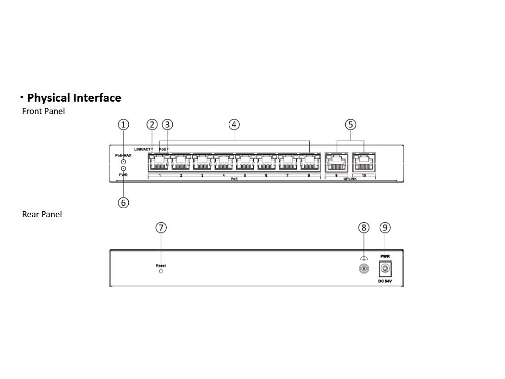 | Popis portů: | 8 x PoE 1 Gbps, 2 x Uplink 1 Gbps |