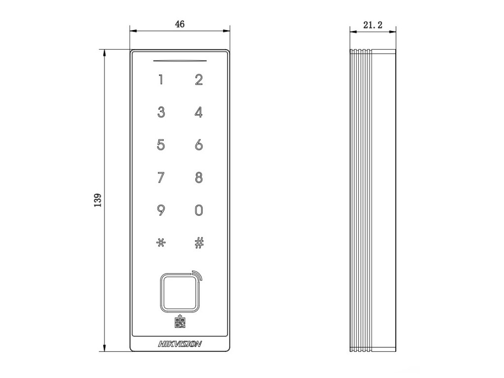 Venkovní systémová RFID čtečka EM Marine(125 kHz), Mifare(13,56 MHz), QR, klávesnice, komunikace RS485 a protokol Wiegand (W26/W34), protokol OSDP, podpora několika způsobů ověření: přečtení čipu/karty, PIN kód, QR kód, Bluetooth(mávnutí ruky s použitím aplikací Hik-Connect a řídící jednotky DS-27XX), krytí IP65, LED indikace stavu + bzučák, povrchová montáž, napájení 12VDC/5W, krytí IP65, pracovní teplota -40 až +65°C, rozměry: 139 x 46 x 21,2 mm.