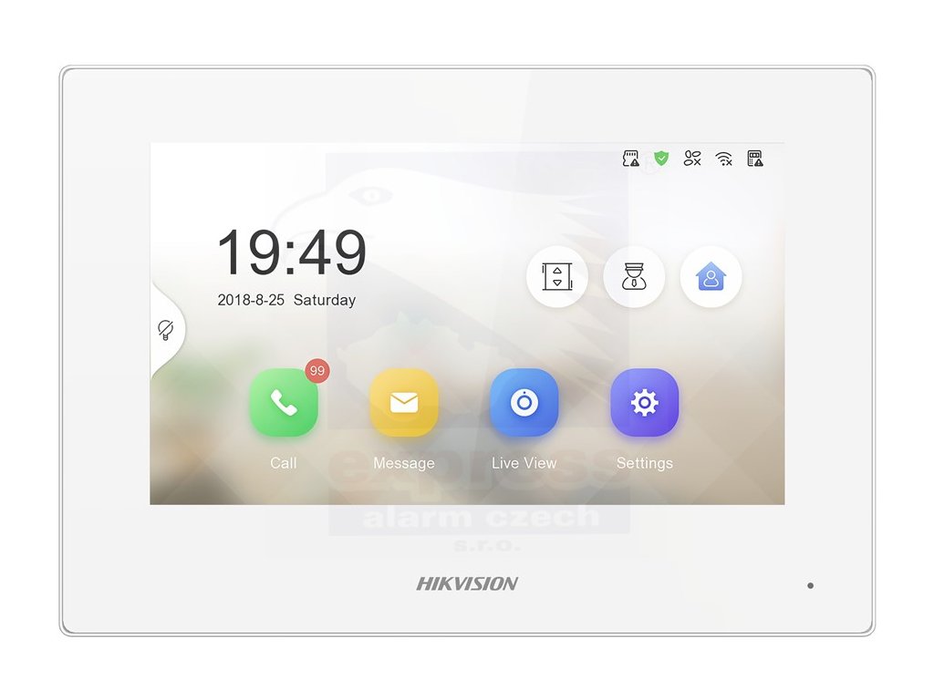 IP videotelefon s dotykovým ovládáním; 7" obrazovka; rozlišení 1024 x 600 dpi; 2-vodičová systém (distributor DS-KAD706) a WiFi; podpora standardního SIP protokolu; slot na SD kartu (max. 32GB); umožňuje sdílení video hovoru s mobilní aplikací HIK-CONNECT pro smartphone/tablet; lze zobrazovat až 16 CCTV kamer z kamerových systémů Hikvision (RTSP stream); česká lokalizace; 2x alarmový výstup(např. pro externí zvonek); 8x alarmový vstupk; distributor DS-KAD706Y; přímá kompatibilta pouze s produkty řady "Y".