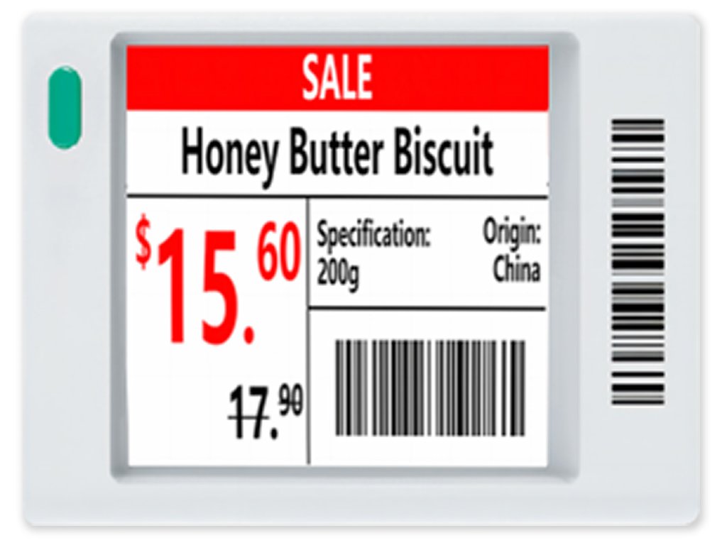Elektronický digitální papír ESL velikost 1.54" pro maloobchodní regálové štítky, kombinace barev černá, bílá, červená. Komunikace s obslužným AP pomocí správy na Cloud účtu a SW třetích stran přes API rozhraní. Napájení knoflíkovou baterií CR2450 3V, 600 mAh, životnost 3 roky při přepisu 4x denně, rozměr 44.5 mm × 35.9 mm × 12.1 mm