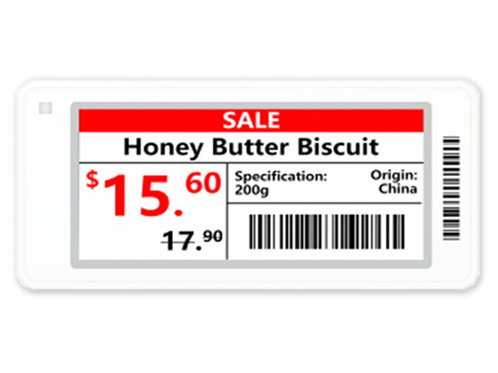 Elektronický digitální papír ESL velikost 2.9" pro maloobchodní regálové štítky, kombinace barev černá, bílá, červená. Komunikace s obslužným AP pomocí správy na Cloud účtu a SW třetích stran přes API rozhraní. Napájení 2x knoflíkovou baterií CR2450 3V, 600 mAh, životnost 5 let při přepisu 4x denně, rozměr 90 mm × 41 mm × 11.1 mm