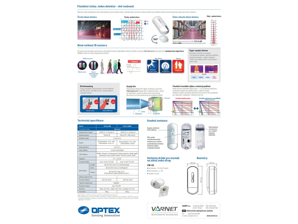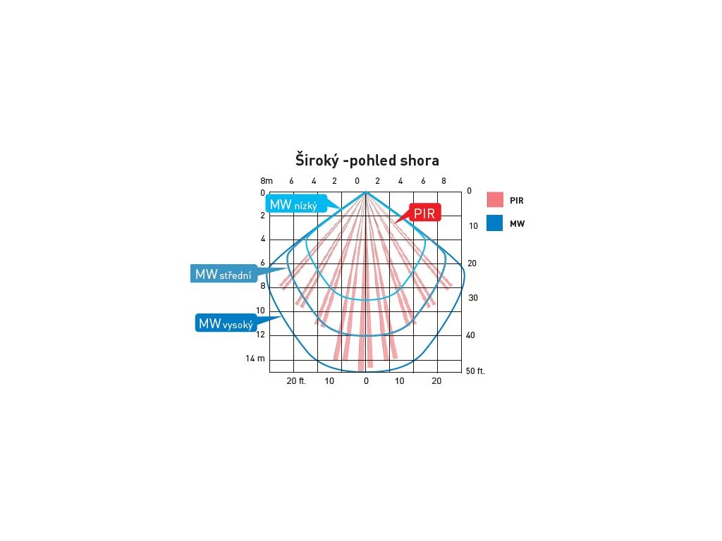 Digitální detektor do vnitřního prostředí s IR antimaskingem. Antimasking detekuje zastínění detektoru a to jak část PIR tak i MW. Kombinace detekce PIR a MW zvyšuje odolnost proti falešným poplachům způsobených sluncem nebo jinými tepelnými zdroji. Detektor používá algoritmy pro eliminaci ostrého slunečního světla a teplotní kompenzaci. Citlivost PIR lze nastavit ve třech úrovních, MW část ve dvou. Rozsah instalace 2 – 3 m umožňuje umístění detektoru pod stropem i u místností s vyššími stropy. Detekci v podhledu při vyšším umístění detektoru zajišťuje doplňková zóna realizovaná zrcátkem. Tato zóna je továrně nastavená, ale lze ji i deaktivovat sklopením zrcátka.