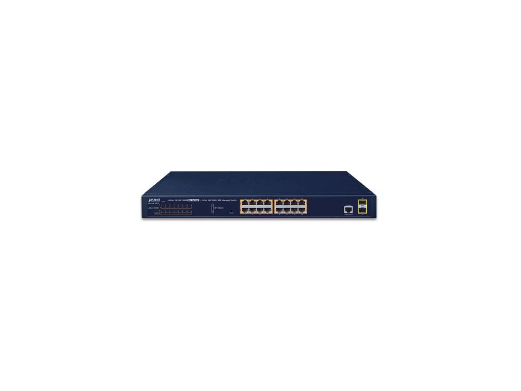 Výkonný 18 portový gigabitový PoE switch 10/100/1000BASE-T, PoE na 16 portech až do 220 W, pro napájení zařízení dle normy IEEE 802.3af a 3at. Management L2/L4. 2 porty 100/1000BASE-X SFP pro připojení na páteřní sítě. Switch má interní zdroj, aktivní chlazení pomocí ventilátorů a kovovou skříň. Instalaci lze provést do rack 19", 1U.