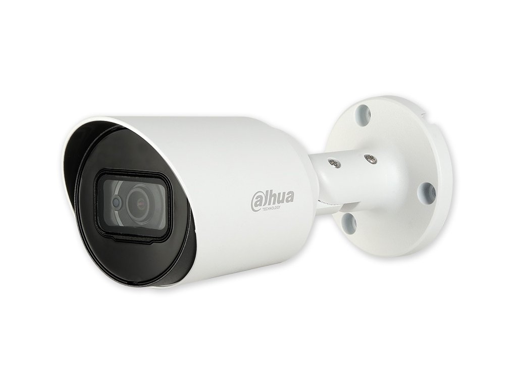 Venkovní kompaktní HDCVI kamera, fixní objektiv 2,8 mm (úhel 105°), integrovaný mikrofon, mechanický IR filtr a Smart přísvit 30 m. 8 Mpix rozlišení při 25 snímků/s, kovový kryt, kabel prochází středem držáku kamery.