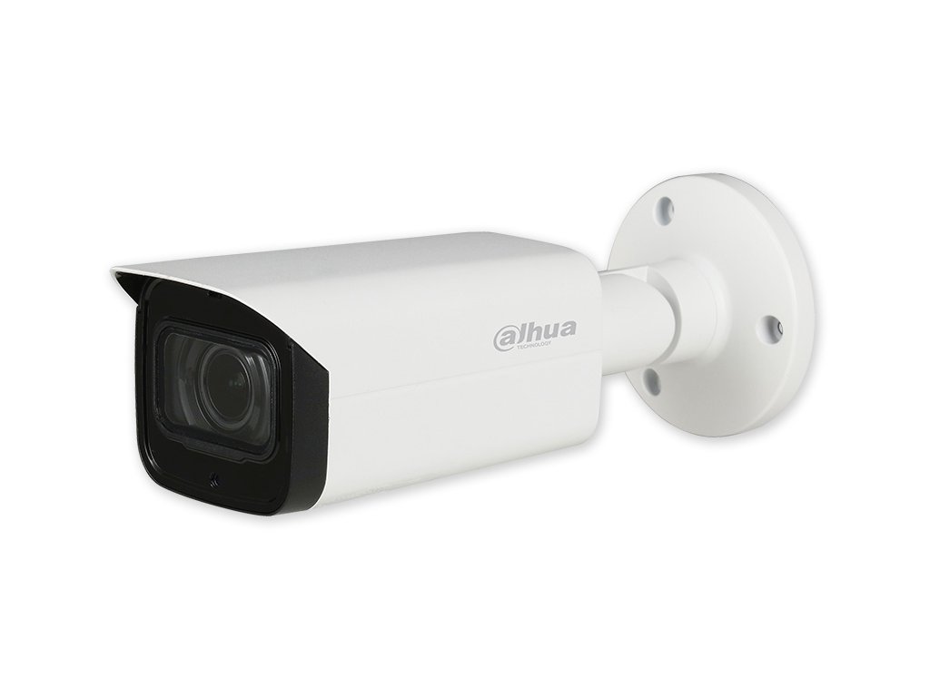 Venkovní kompaktní HDCVI kamera, fixní objektiv 3,6 mm (úhel 87°), integrovaný mikrofon, mechanický IR filtr a Smart přísvit 80 m. 8 Mpix rozlišení při 15 snímků/s, kovový kryt, kabel prochází středem držáku kamery.