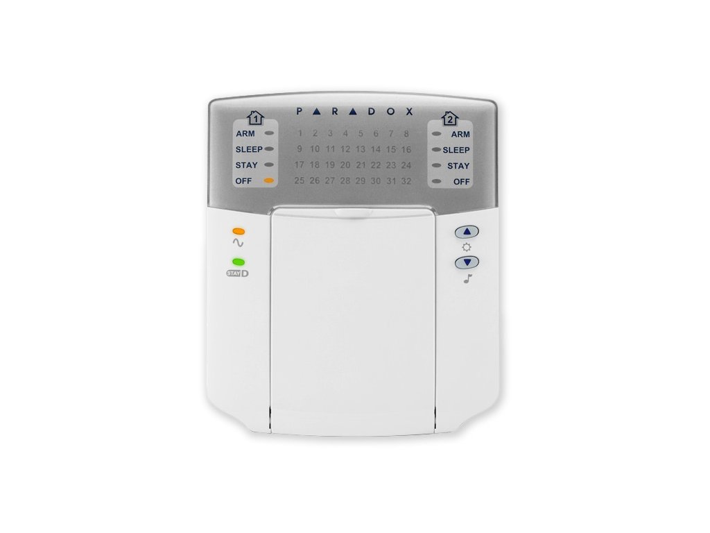 Drátová LED klávesnice K32+. Klávesnice je podsvícená, odděleně zobrazuje stavy dvou oblastí pomocí LED diod a všech 32 zón v systému SPECTRA SP nebo MAGELLAN.