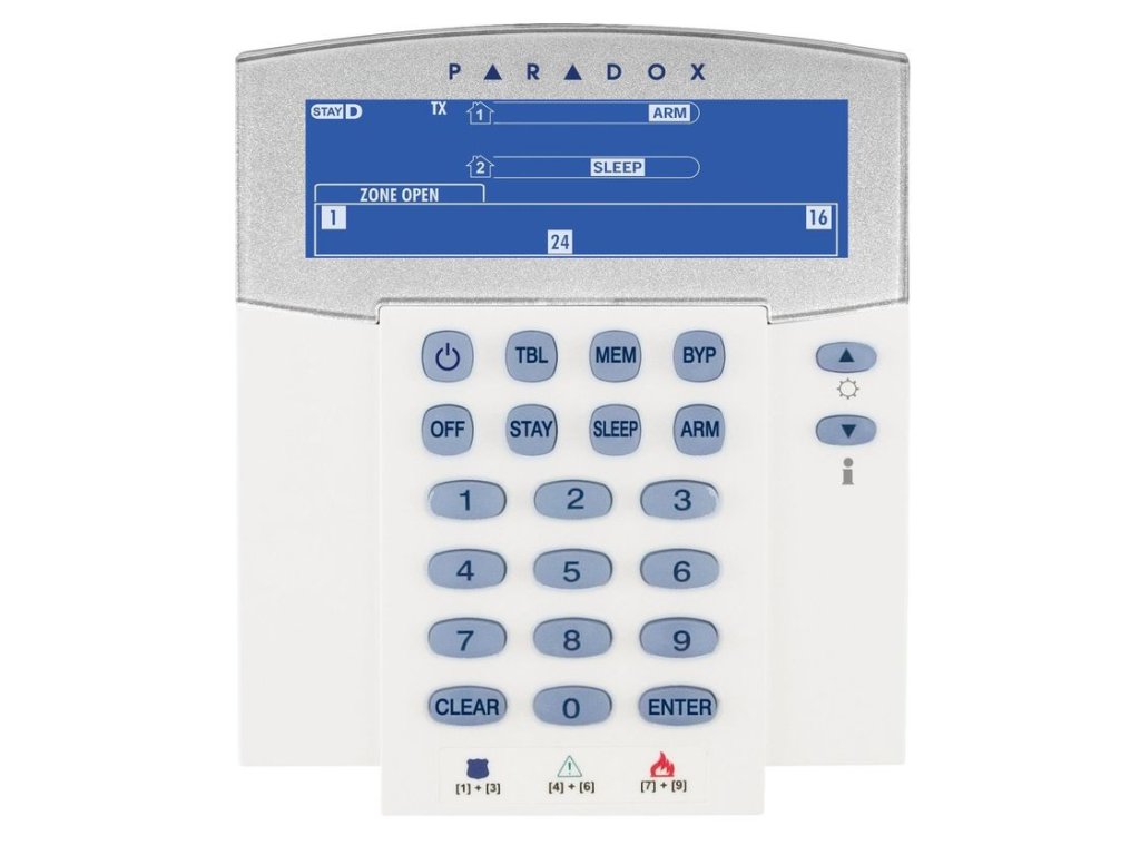 | Zobrazování stavu systému: | displej, klávesnice - 32 zón,, zobrazené dva podsystémy,, ARM, SLEEP, STAY, OFF |
