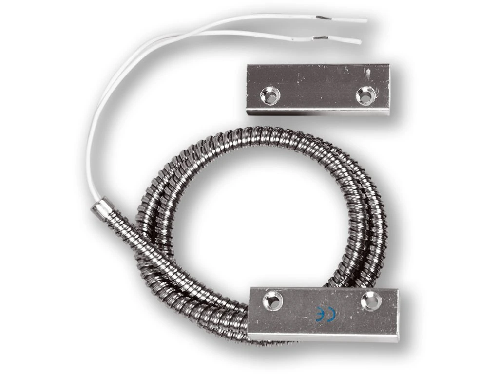 Čtyřdrátový magnetický kontakt v masivním provedení, určený pro povrchovou montáž na velká vrata a průmyslové použití. Drátové vývody v pancéřové chráničce.