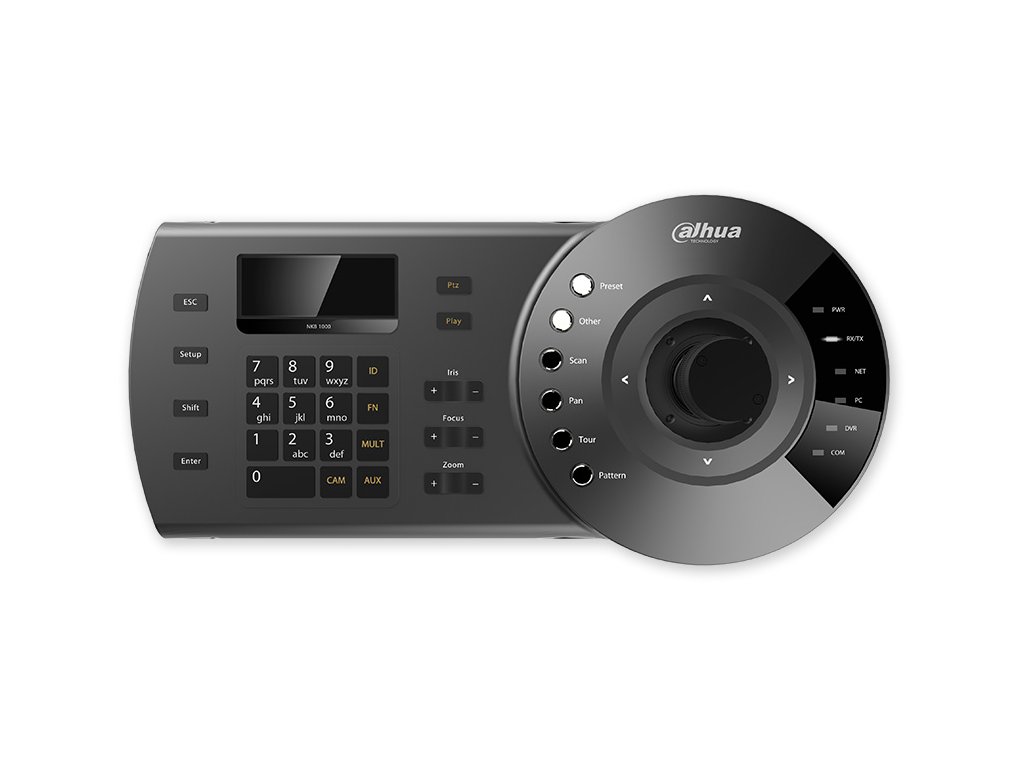 Multifunkční klávesnice s elektromechanickým 3 vektorovým joystickem pro ovládání PTZ analogových a IP otočných kamera Dahua. Komunikace po síti (RJ45) i přímá po sériových portech (RS-232, RS-485) a USB. Protokoly DH-SD, DH-2, Pelco P/P1, Pelco D/D1.