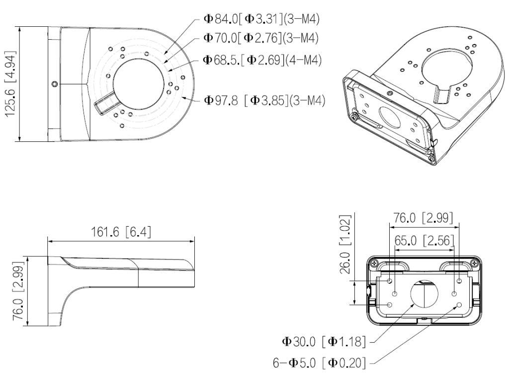 Nástěnná konzole pro montáž DOME kamer Dahua. Maximální průměr kamery 126 mm.