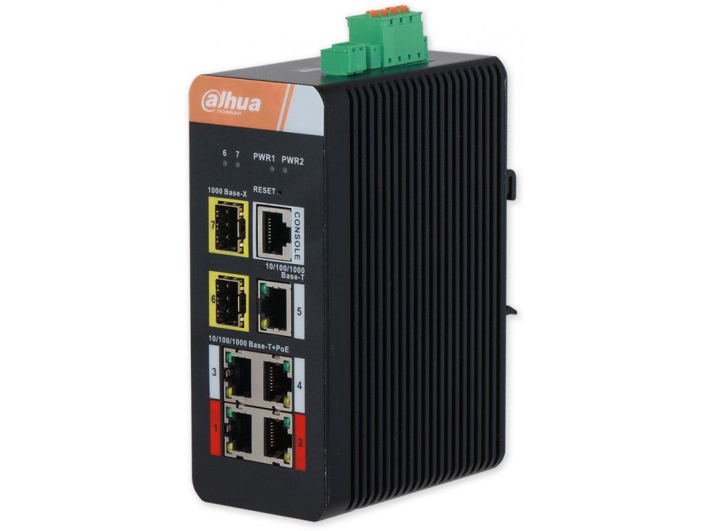 průmyslový PoE switch s optickou a metalickou páteří, 4 x PoE 10/100/1000 Mbps, 1 x uplink 10/100/1000 Mbps, 2 x SFP uplink 1000 Mbps, PoE norma 3af (15,4 W), 3at (30 W), Hi-PoE (60 W), 3bt Hi-PoE (90 W), celkový budget je 120 W, přepěťové ochrany, stolní nebo DIN provedení, napájení z externího adaptéru 48-57 VDC (není součástí balení).