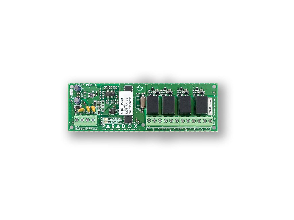 Modul PGM výstupů, připojený na BUS sběrnice ústředen SPECTRA SP / MAGELLAN MG / DIGIPLEX EVO. Modul slouží k rozšíření o 4 programovatelné výstupů v provedení relé. V systému DIGIPLEX EVO je počet instalovaných modulů PGM4 omezen na 8, v systémech SPECTRA SP a MAGELLAN je možné použít pouze jeden modul.
