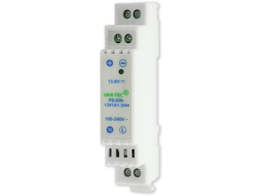 Spínaný zdroj na DIN lištu s výstupním napětím 13,8 V/1,2 A v plastovém krytu. Napájení přímo 230 V, výstup pro připojení záložního akumulátoru (0,1 A, max. 1,3 Ah). Provedení modul do rozvaděče.