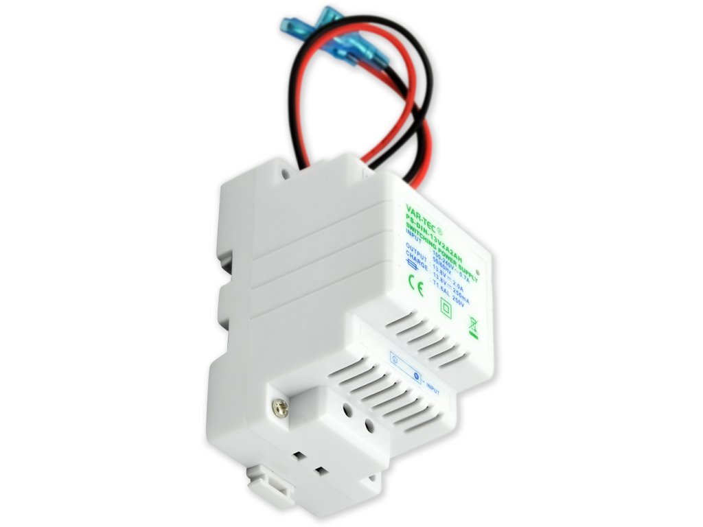 Spínaný zdroj na DIN lištu s výstupním napětím 13,8 V/2 A v plastovém krytu. Napájení přímo 230 V, výstup pro připojení záložního akumulátoru (0,25 A, max. 4 Ah). Provedení modul do rozvaděče.