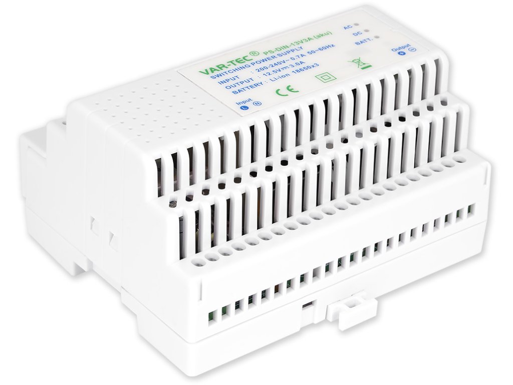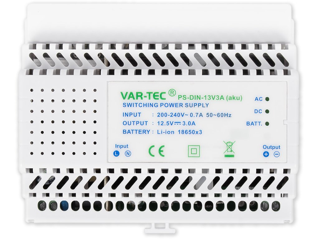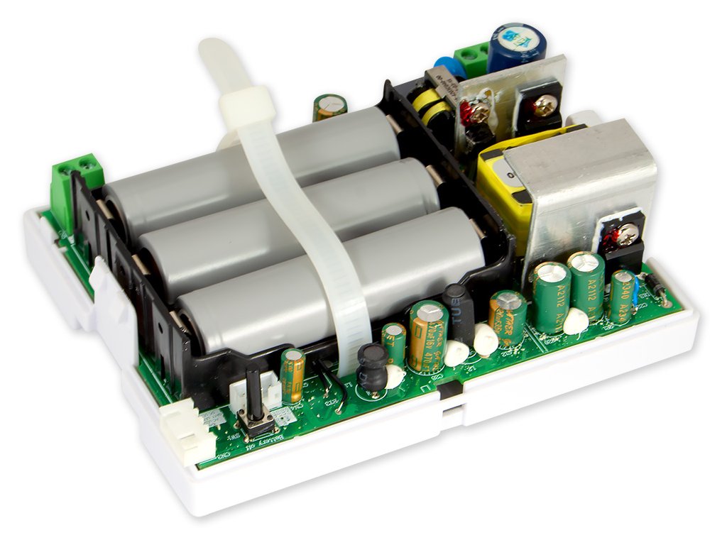 Spínaný zdroj na DIN lištu do rozvodné skříně. Zdroj má integrovaný LiON akumulátor 3x 18650 (3x 3,6V). Výstupní napětí 13,8 V/3A v plastovém krytu. Napájení přímo 230 Vac.