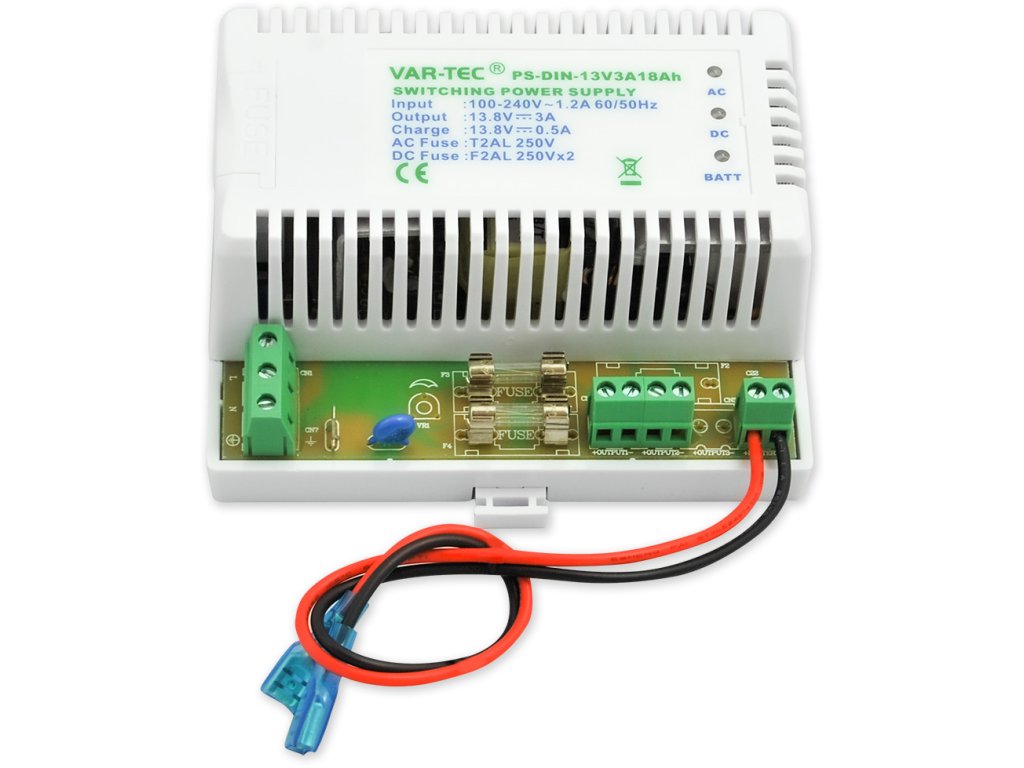 Spínaný zdroj na DIN lištu s výstupním napětím 13,8 V/3 A v plastovém krytu. Napájení přímo 230 V, výstup pro připojení záložního akumulátoru (0,5 A, max. 18 Ah).