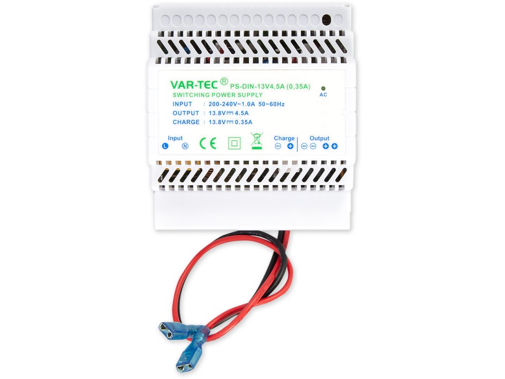 Spínaný zdroj na DIN lištu do rozvodné skříně. Zdroj má zdvojené svorky AUX. Výstupní napětí 13,8 V/4,5A v plastovém krytu. Napájení přímo 230 V, výstup pro připojení záložního akumulátoru (0,35 A, max. 7 Ah).