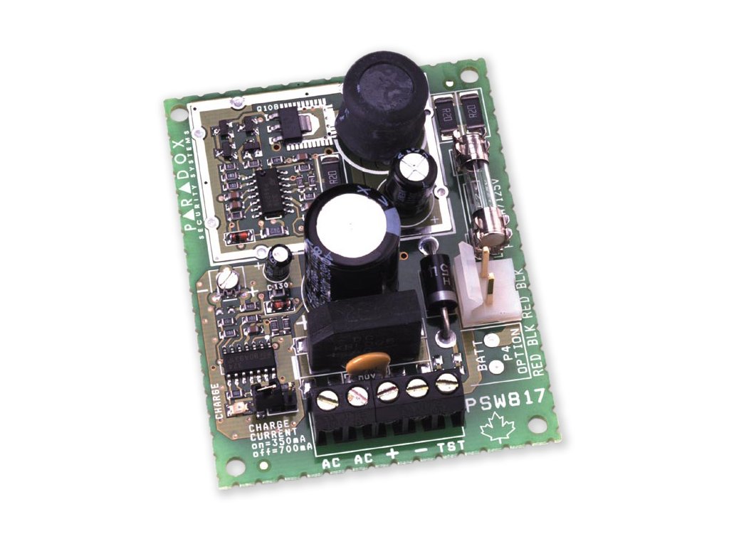 Přídavný spínaný zdroj s možností připojení záložního akumulátoru (max. kapacita 18 Ah) s regulací výstupního napětí. Zdroj je chráněn proti přepólování akumulátoru pojistkou a musí mít vlastní transformátor pro napájení. Na výstupu transformátoru nesmí být připojené jiné zařízení než zdroj PS 817.
