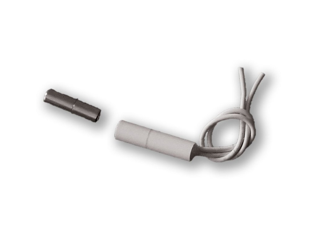 Dvoudrátový menší závrtný magnetický kontakt určený pro zápustnou montáž do oken, dveří atd..