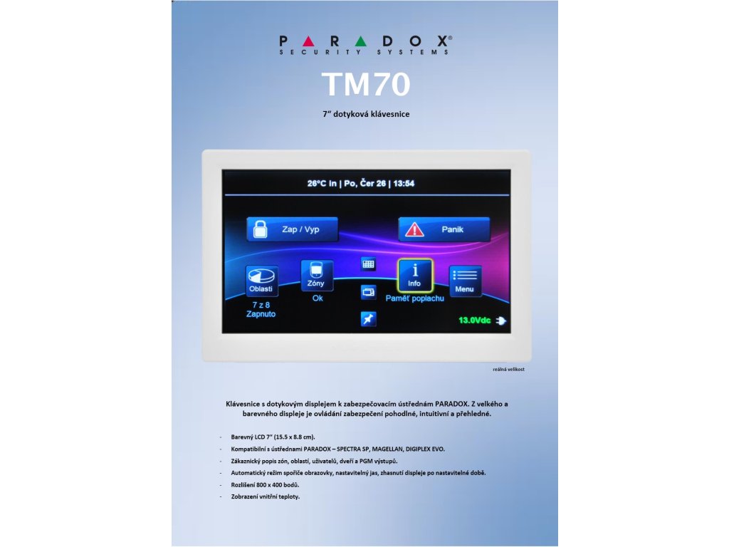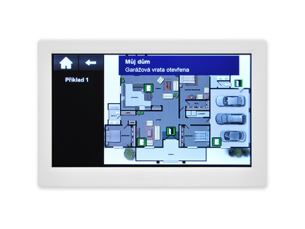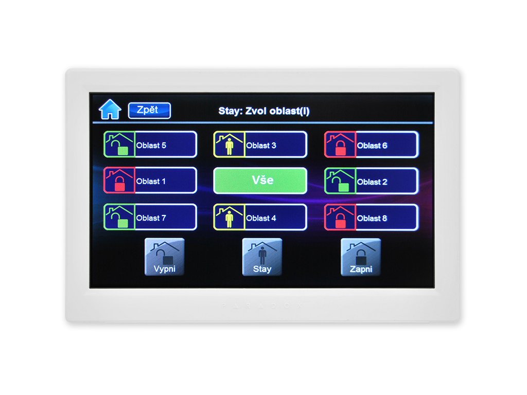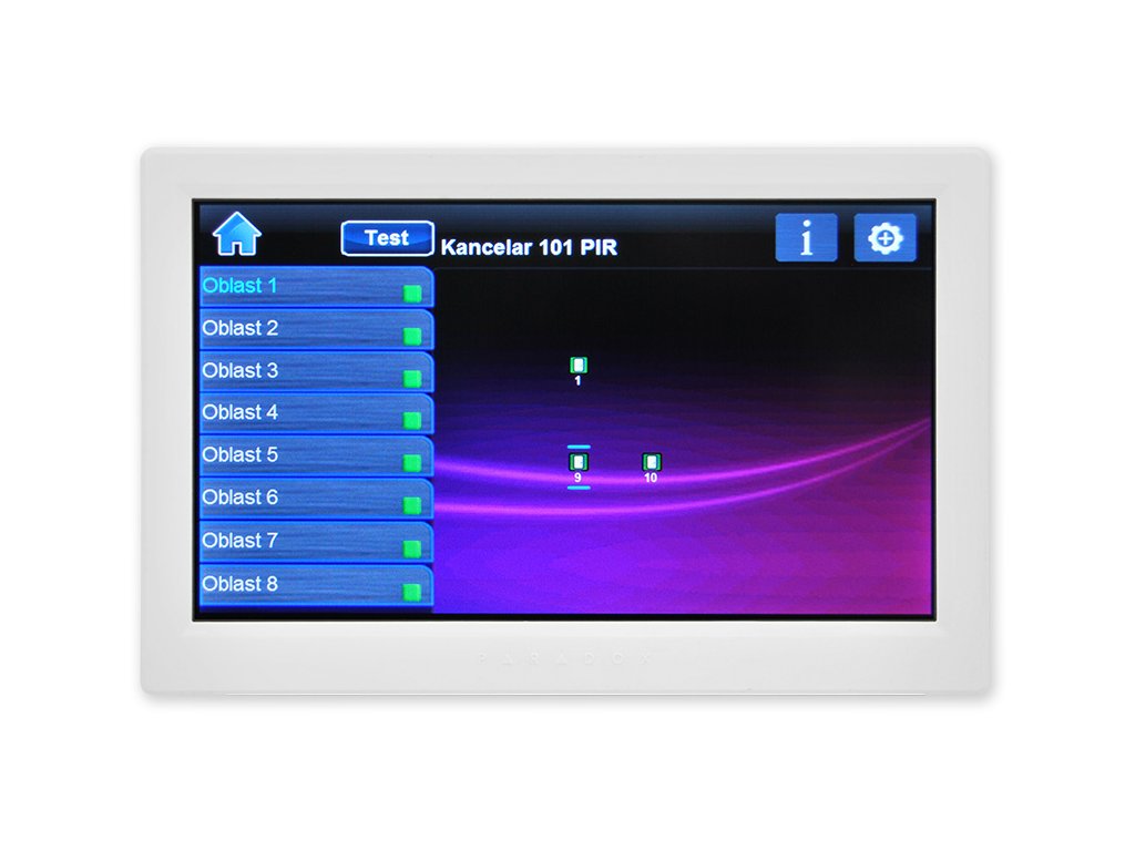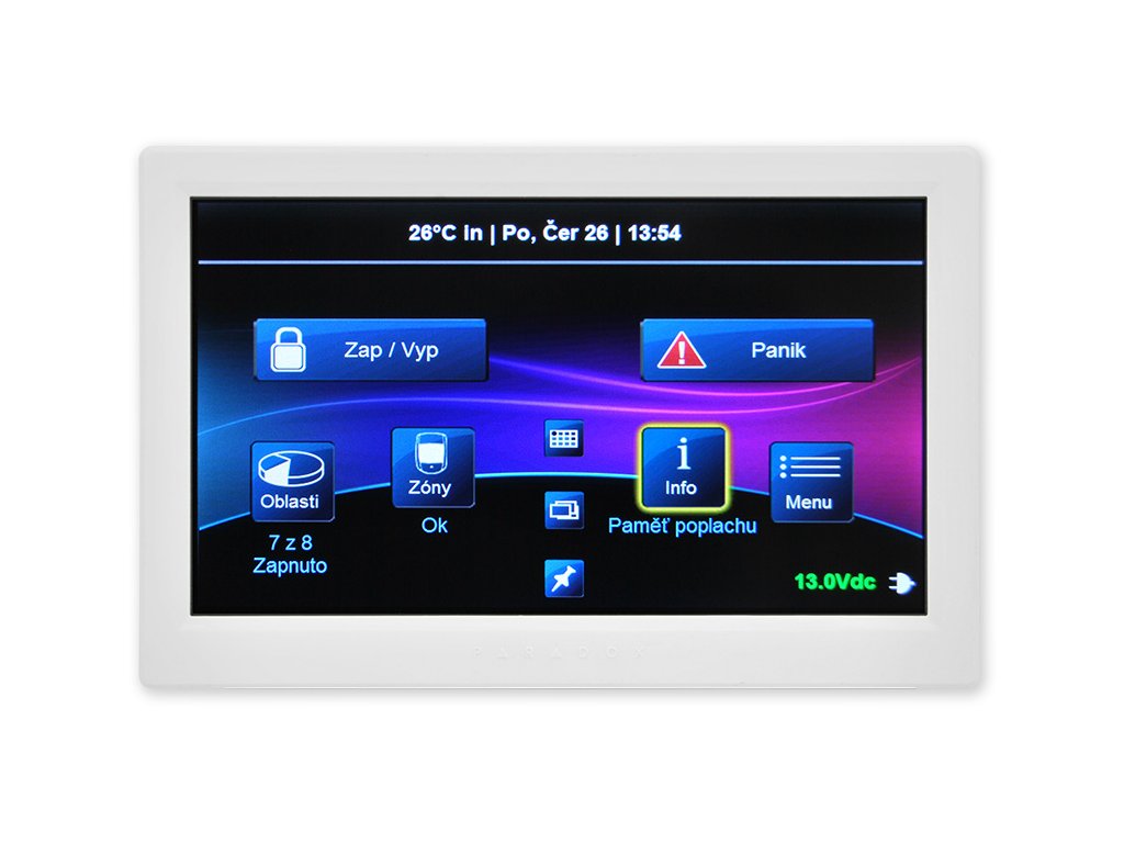 Moderní grafická klávesnice s dotykovým 7" barevným LCD displejem. Signalizace stavu systému je pomocí ikon a textů a ovládání probíhá přímo pomocí dotykového LCD. Ovládání je velice přehledné, intuitivní a uživatelsky pohodlné. Klávesnice může zobrazovat vnitřní a venkovní teplotu i půdorysy zabezpečeného objektu se zobrazením stavu jednotlivých čidel. Umožňuje na LCD zobrazovat "Annunciátor" - přehledné zobrazení stavu podsystémů a zón. V klávesnici lze nastavovat uživatelské přizpůsobení, vkládat obrázky a využívat bohatou nabídku zvuků.