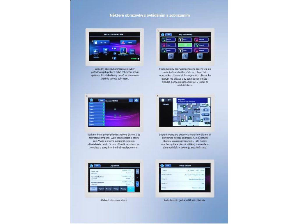 Grafika: | 32 (EVO) / 8 (SP/MG) půdorysů, Annunciátor - přehledné zobrazení stavu podsystémů a zón |