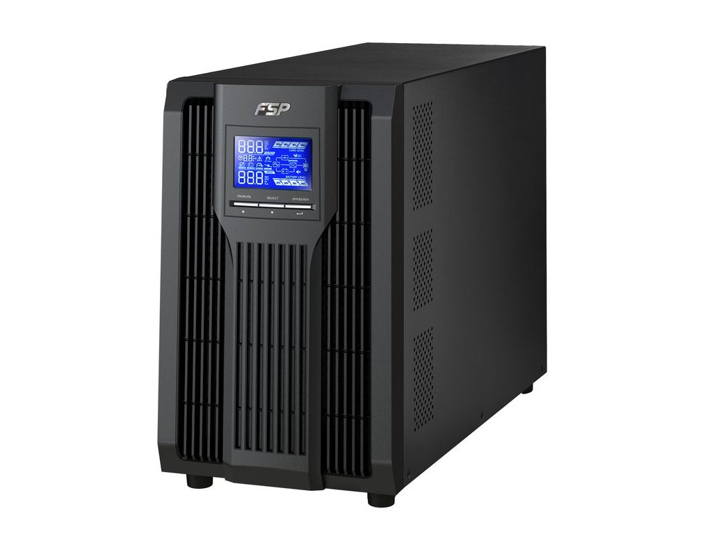 Záložní zdroj UPS TOWER FSP-3000VA Psin typu Online. Přehledný LCD displej na čelním panelu zobrazuje vstupní a výstupní hodnotu napětí, stav baterie a zatížení UPS. Místní monitoring UPS přes port USB nebo RS-232. Pro dálkový monitoring je možné doplnit SNMP kartu pro připojení do sítě ethernet, reléovou kartu s výstupy poruch a vstupy pro ovládání UPS nebo Modbus kartu pro řízení a monitorování v reálném čase prostřednictvím komunikačního portu RS-485.