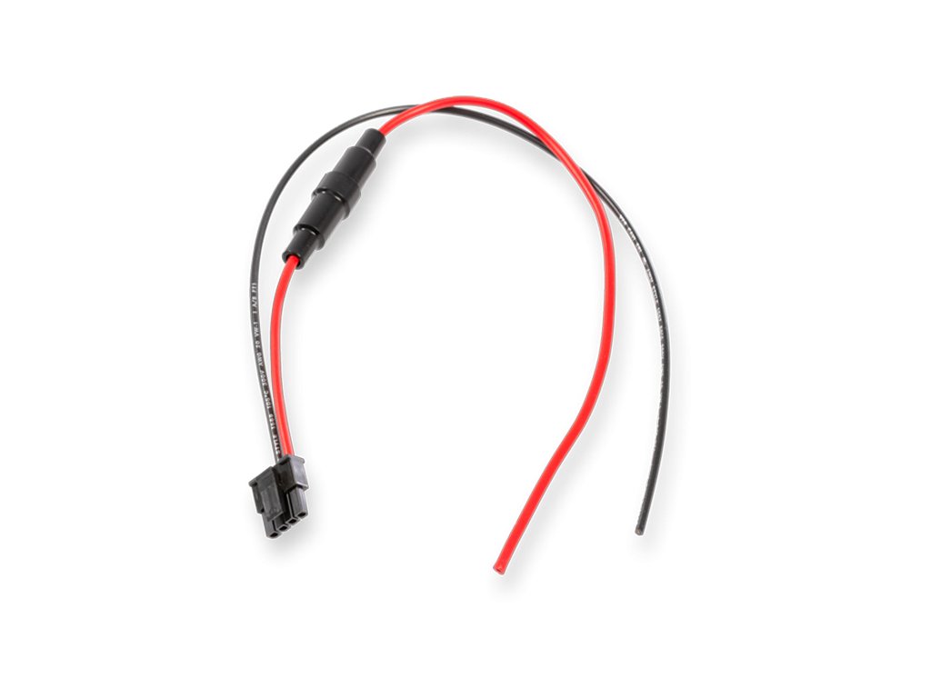 Napájecí kabeláž s držákem pojistky, pojistkou 6,3 A a konektorem pro připojení ústředny JA-107K k externímu zdroji 12V DC, např. systém solárních panelů.